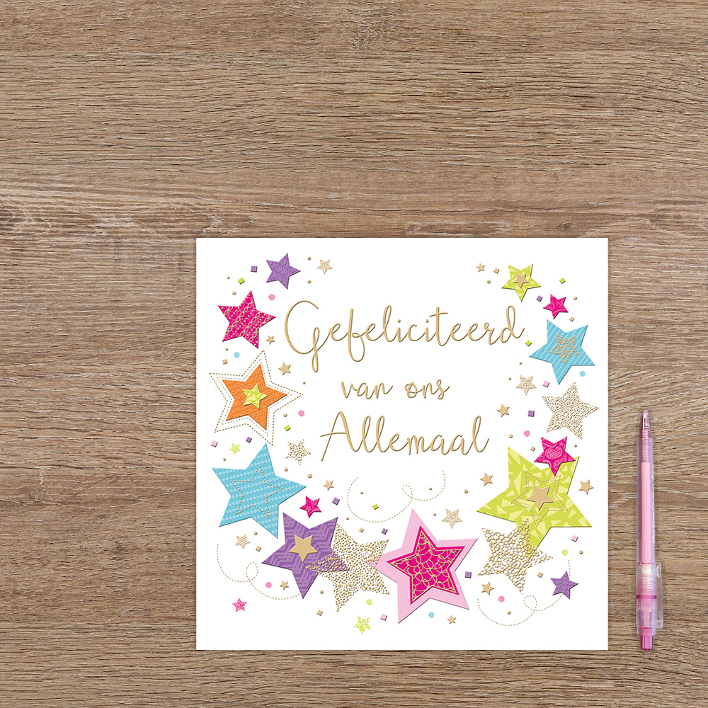 De wenskaart heeft een afmeting van x en een vierkante vorm. Op deze wenskaart staan sterren in diverse kleuren met in het midden de tekst: "Gefeliciteerd van ons allemaal". De binnenzijde van de wenskaart is blanco wat voldoende ruimte geeft om een persoonlijke boodschap te schrijven .
