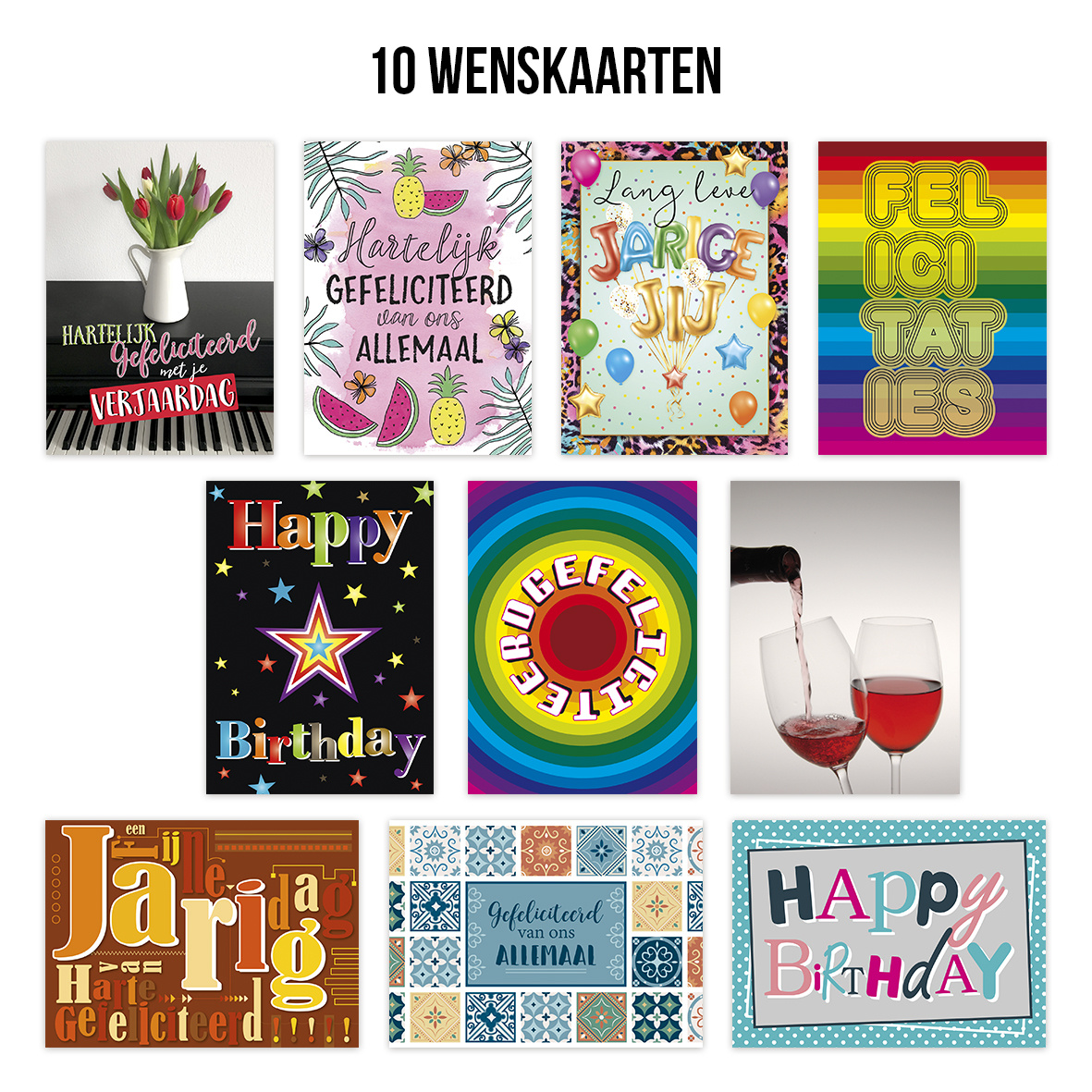 Een uitgebreid pakket met 10 verjaardagskaarten. Alle wenskaarten zijn voorzien van een envelop.
